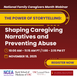 In recognition of National Family Caregivers Month, the National Center on Elder Abuse, USC Family Caregiver Support Center, and Hollywood, Health & Society are hosting a webinar to highlight the power of storytelling to explore and elevate caregiving relationships in media. Too often, nuances of caregiving and related challenges are not portrayed or inaccurately depicted in popular culture. Audience’s attitudes are shaped by the stories they consume – whether through television, film, social media, or literature.Â